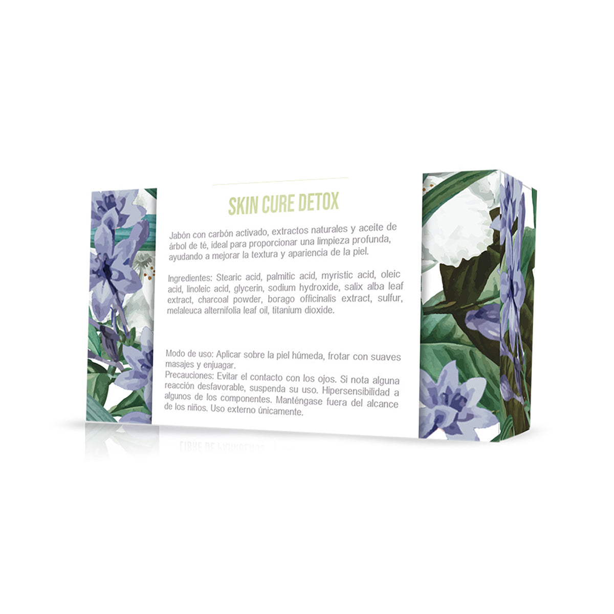 Skin cure Jabón Detox es un mezcla de extracto de borraja, extracto de sauce, aceite de árbol de té, carbón activado y azufre. Esta combinación limpia profundamente la piel, contribuyendo a mejorar su apariencia y textura. Presentación: barra por 100 g.